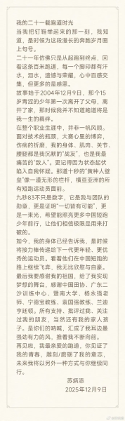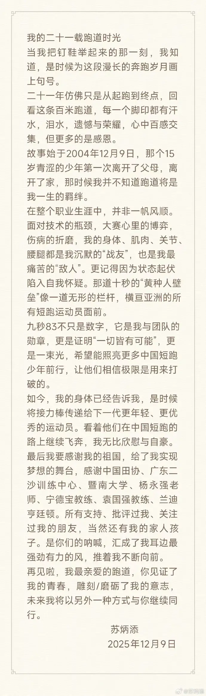 北京时间12月9日,36岁的中国短跑运动员苏炳添在社媒发文,正式宣布退役。