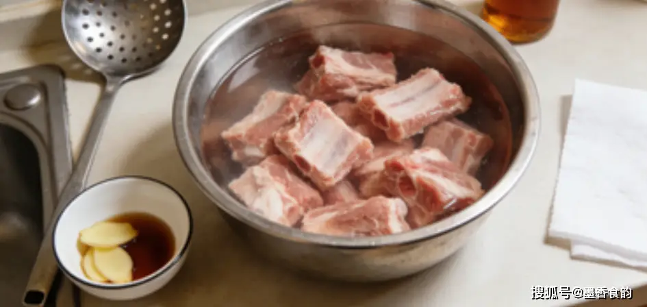 排骨别直接下锅炖,先用冷水泡20分钟,泡出血水能减少腥味。然后冷水下锅,加姜片和料酒焯水,水开后撇去浮沫,捞出后用温水冲洗干净。