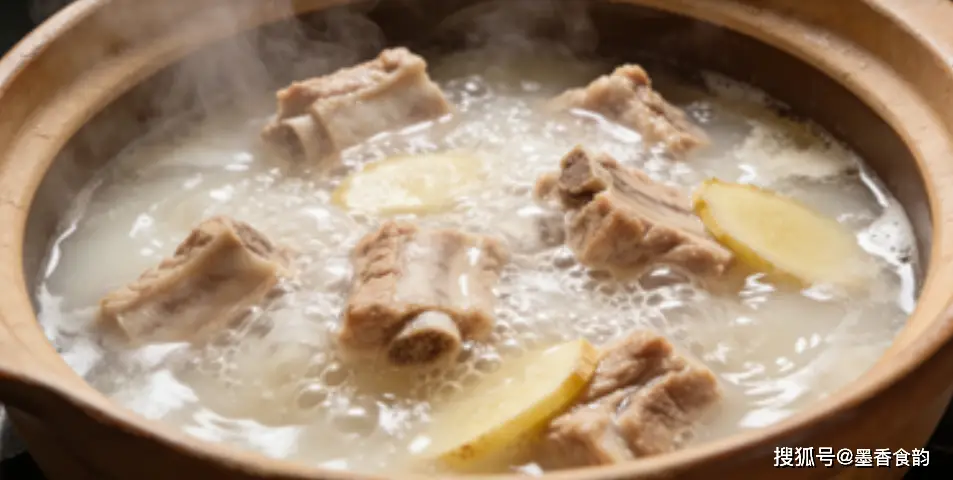 用砂锅炖汤效果最好。把焯好水的排骨、几片生姜放入锅中,一次性加足热水——记住一定要是热水!这样汤色更容易变成奶白色。