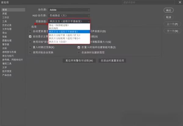 “首选项/常规”中指定的图像插值方法适用于大多数操作,比如使用仿制图章工具进行放大或缩小仿制时就使用此处指定的插值方法。