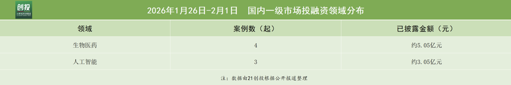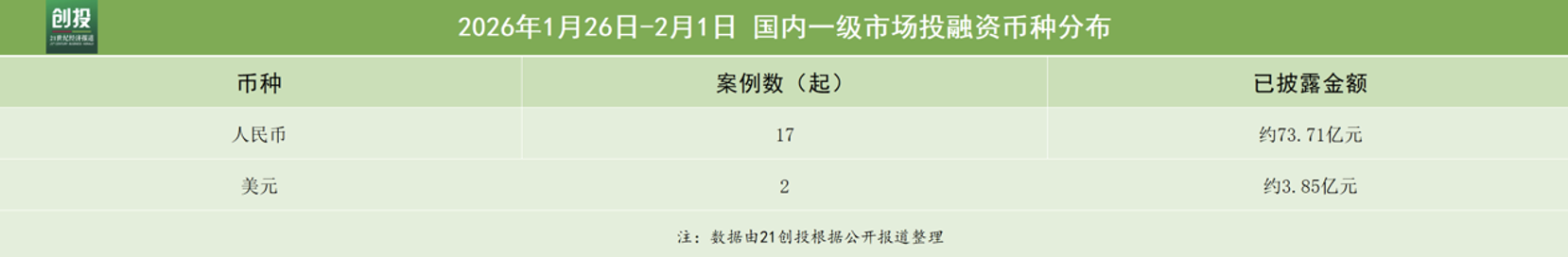 21创投不完全统计1月26日—2月1日,报告日期内国内一级市场发生融资事件24起。其中,有19笔融资披露了融资金额和币种信息,总规模约合人民币77.56亿元人民币。