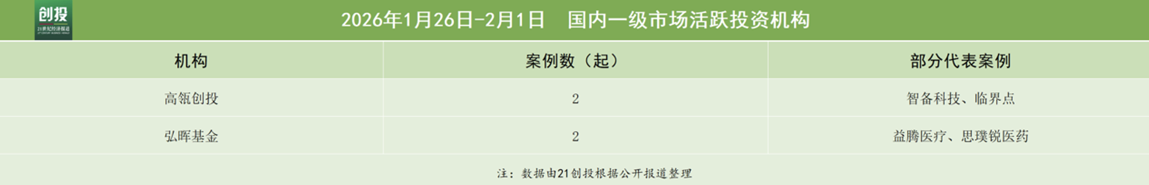从机构投资活跃度来看,本周高瓴创投与弘晖基金较为活跃,分别完成2笔融资,主要聚集在科技与制造和医疗健康领域。
