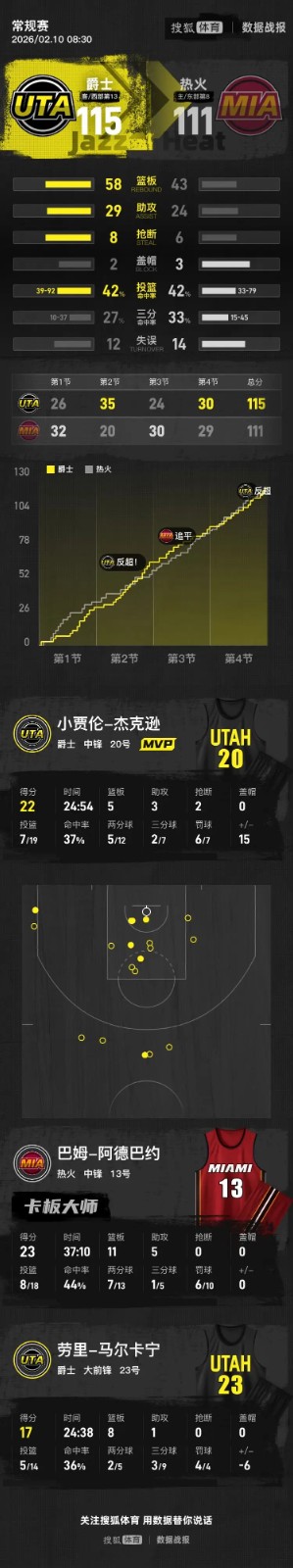 【搜狐体育战报】北京时间2月10日NBA常规赛,客场作战的爵士以115-111击败热火。菲利波夫斯基16分11篮板2助攻,阿德巴约23分11篮板5助攻。