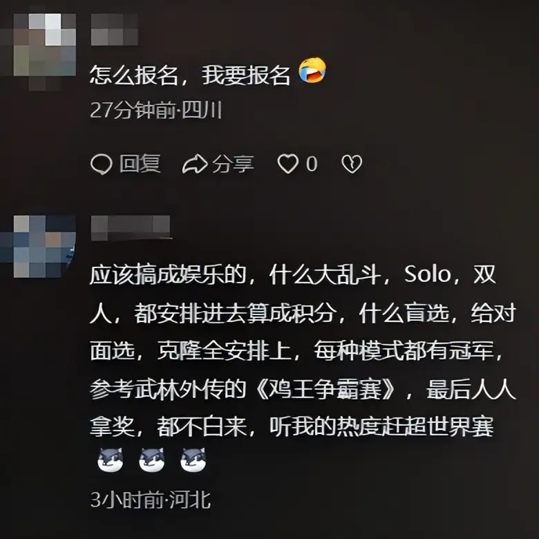 对此,很多粉丝都在出谋划策:“应该搞成娱乐的,什么大乱斗,Solo,双人,都安排进去算成积分,什么盲选,给对面选,克隆全安排上,每种模式都有冠军,参考武林外传的《鸡王争霸赛》,最后人人拿奖,都不白来,听我的热度赶超世界赛”,“参加就有钱?有没有哥们来组黑铁队”,“自掏100万拯救LPL流量?YYDS”……