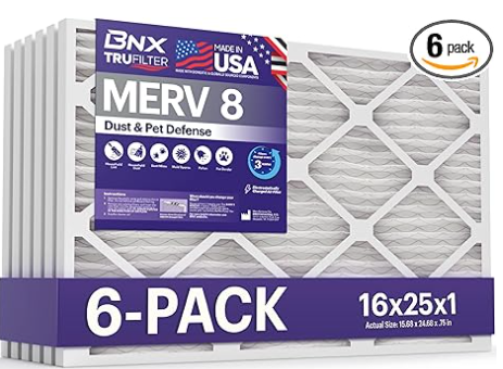 16x25x1 MERV 8 空气过滤器替换件,适用于空调、炉或 HVAC 系统。 实际尺寸:15 11/16 英寸 x 24 11/16 英寸 x 3/4 英寸。 与 MPR 600 和 FPR 5 相媲美。 静电过滤介质具有行业领先的低气流阻力。
