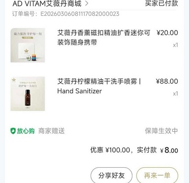 买艾薇丹好处就是它家送券并且积分兑换都很厉害,之前买了它家大套装就有2张100的券送!看了一下我的无门槛券快过期了,赶紧去补点货,这次我选的是手喷,之前囤了好几只,但是送人了,这次就直接买个手喷再加个香薰扣,最后实付8元到手!