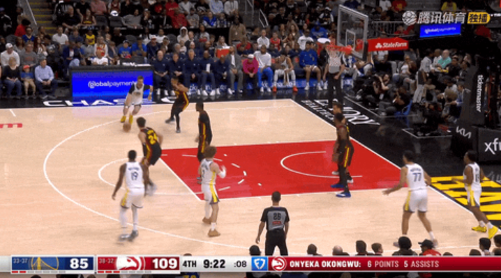 易边再战还剩11分30秒时,奥孔古补篮掀起攻势,老鹰在11分30秒至9分37秒的5次进攻全部得分,将比分从61:63拉大到63:75;期间盖耶、沃克和麦科勒姆在还剩10分10秒到9分18秒内连续命中三记三分。随后的5分钟里,老鹰又在还剩11分9秒至6分16秒间打出25:3高潮,将比分彻底拉开到66:90,三节打完勇士81:102落后。