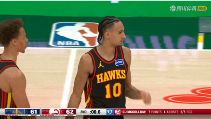 次节回来还剩11分45秒时,斯宾塞突破上篮先拿2分,勇士一度将比分拉开到47:40。第二节还剩2分30秒起,老鹰由盖耶三分、沃克罚球和上篮、丹尼尔斯突破抛投连续得分,在还剩44秒时反超到57:59。第二节还剩34秒时,格林两罚全中扳成59平,16秒时麦科勒姆打板抛投命中,6秒时梅尔顿两罚再度追平为61:61,节末压哨麦科勒姆罚中两球,勇士61:63落后结束上半场。
