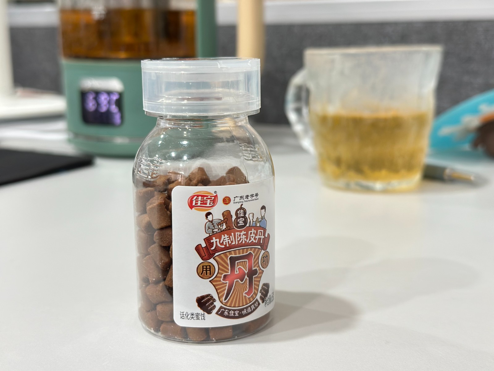 最近特别突然想吃童年零食陈皮丹,买了4瓶,家里、车里、办公室都放了一瓶,还是记忆中的味道,吃起来酸酸的很开胃。一般开车的时候我会嘴里塞几颗,清凉提神。办公室里吃这个最好了,没有声音没有太大的味道,需要静下心来写材料的时候随时可以来几颗。小时候我们这边叫这个陈皮丹为“老鼠屎”或者“华华丹”,很古早的记忆了。而且我觉得这个对于抽烟的人来说应该是有抑制烟瘾的作用,以前我的大老板烟瘾很大,桌上常备这个陈皮丹,在不方便抽烟的场合就可以嚼一颗。