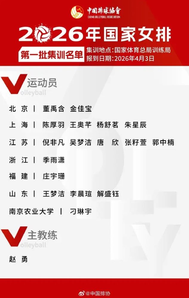 新华社北京4月2日电(记者王镜宇、韦骅)中国女排2026年首批集训名单2日正式出炉,球队的目标是夺取亚锦赛冠军,从而取得2028年洛杉矶奥运会的入场券。