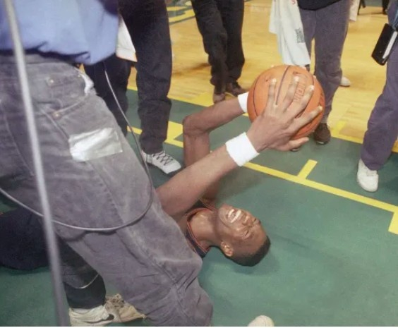 1997-98赛季季后赛,范甘迪抱莫宁大腿被拖行数米