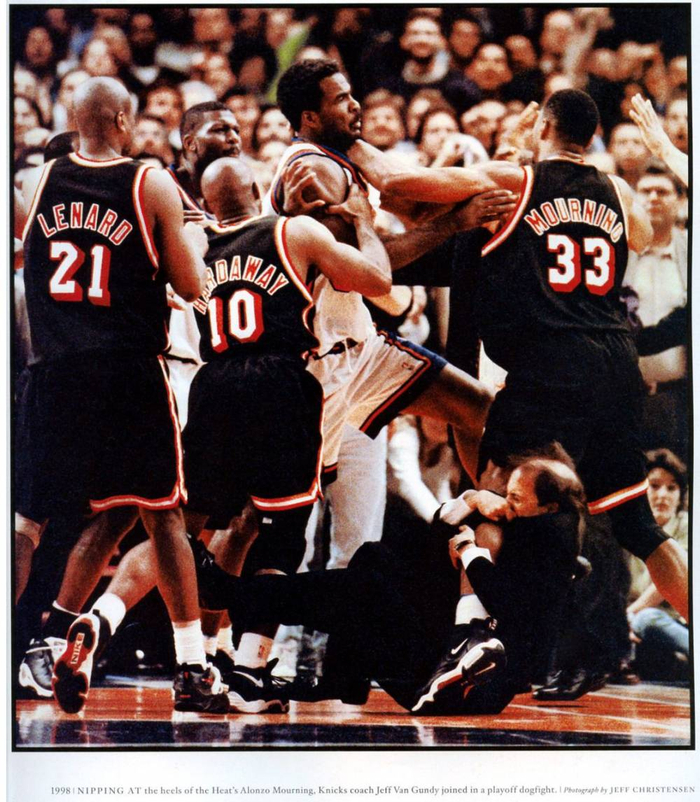 1998-99赛季,联盟赛季初经历劳资停摆,因此这是一个缩水赛季,加上乔丹第二次宣布退役,联盟格局重组;由帕特·莱利领军的作风强硬的热火,在联盟盖帽王和DPOY莫宁的加持下,跃升为东部霸主。而尼克斯在尤因带伤出战的情况下,由“中投王”阿兰·休斯顿率队;两队在90年代堪称世仇宿敌,就在上赛季莫宁还与拉里·约翰逊拳脚相向,也诞生了时任尼克斯主帅小范甘迪球场抱莫宁大腿被拖行数米的名场面。